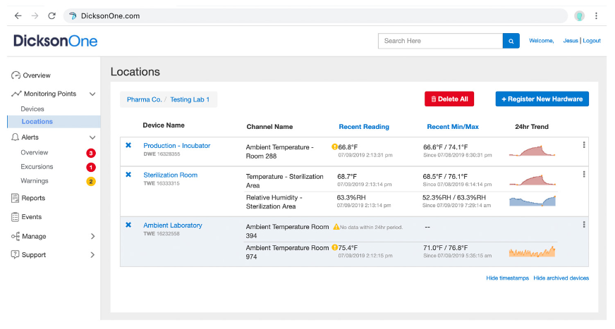 DicksonOne allows even the most heavily regulated environments to meet compliance requirements with ease. The platform complies with U. S. FDA 21 CFR Part 11 Guidelines to meet data integrity and reliability standards. It also reduces burden on staff by automating monitoring activities and provides monitoring for multiple locations from a single platform (See Figure 1).