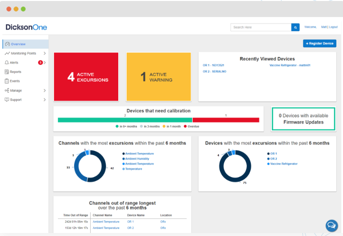 A comprehensive dashboard and reporting capabilities keeps all the data at your fingertips, in a view that provides instant information. The dashboard (See Figure 2) displays all critical monitoring information on one screen. Immediately attend to alerts and warnings, understand device performance over time, and much more. Dickson can help create customized, automated reports to reliably collect the data that matters most to your business needs.