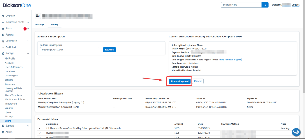 - You also have the option to update your credit card information to a new card by clicking Update Payment on the right so that your payment can be processed