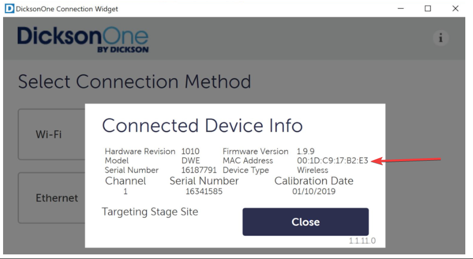 The MAC Address will only be displayed on DicksonOne after the device has been registered. If the device has not been registered to DicksonOne, please continue reading.