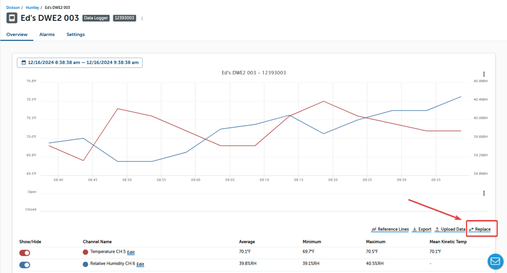 The new device will now begin to collect data. Be sure to review the Device Settings, and ensure that any reports and alarms are updated accordingly. To learn more on DicksonOne, please visit the DicksonOne Knowledge Base.