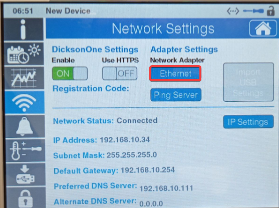 Unlike the DWEs that can easily be plugged into Ethernet, the DicksonOne Touchscreen devices are automatically programmed to have the WiFi turned on and must be configured for Ethernet in a couple of quick easy steps below.