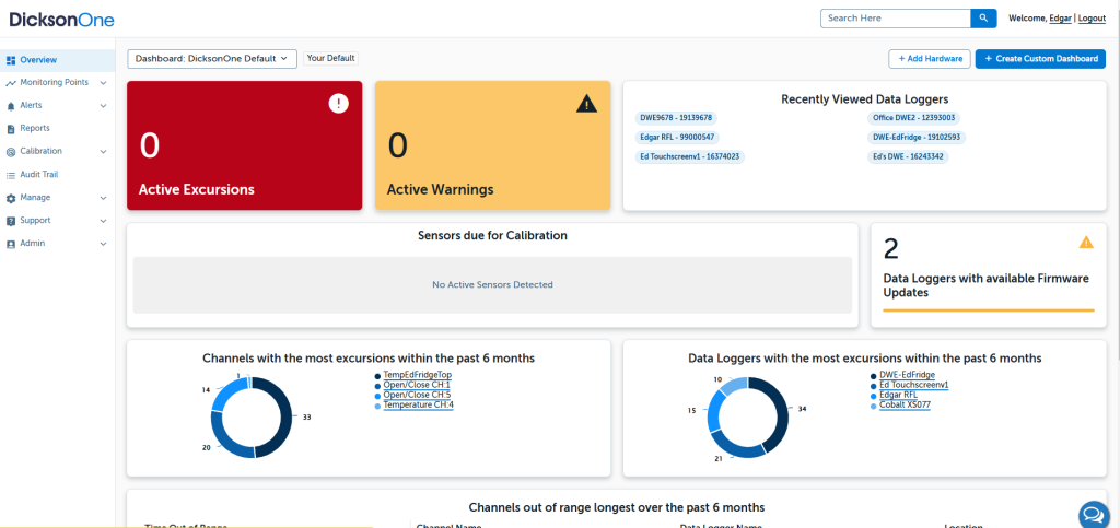 • The Dashboard includes Active Excursions and Active Warnings, Firmware Updates, various metrics on your monitoring points and more.