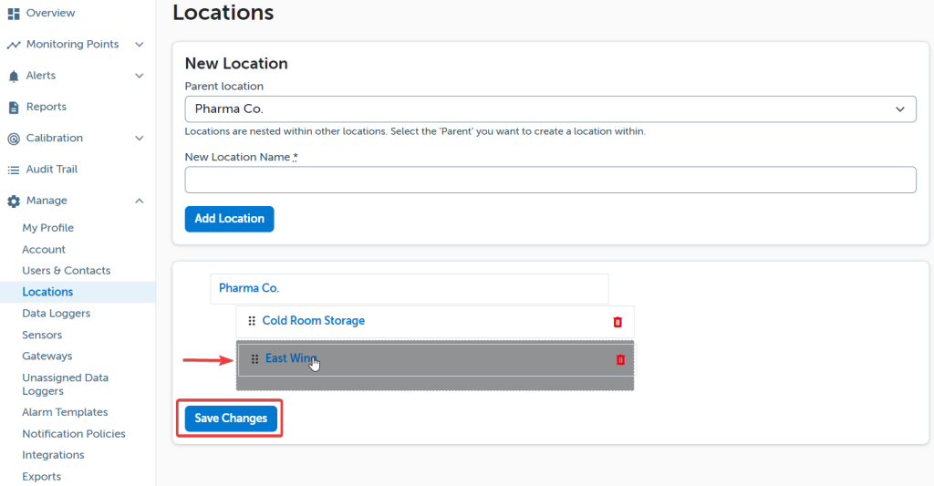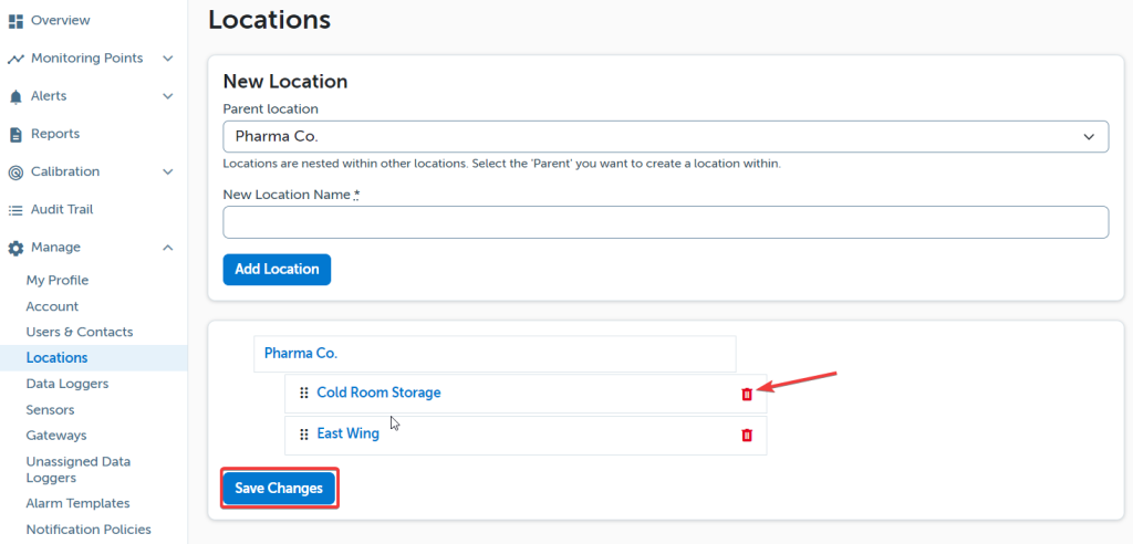 - Locations can allow users to control how devices in the account are organized by location and/or application (i.e. Laboratory, Refrigerators, Pharma Co., etc.)