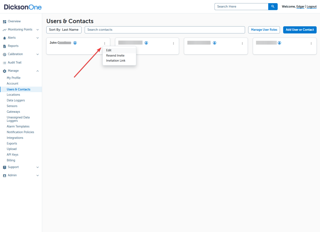 - In the Users and Contacts page, click on the Kebab menu in a user card