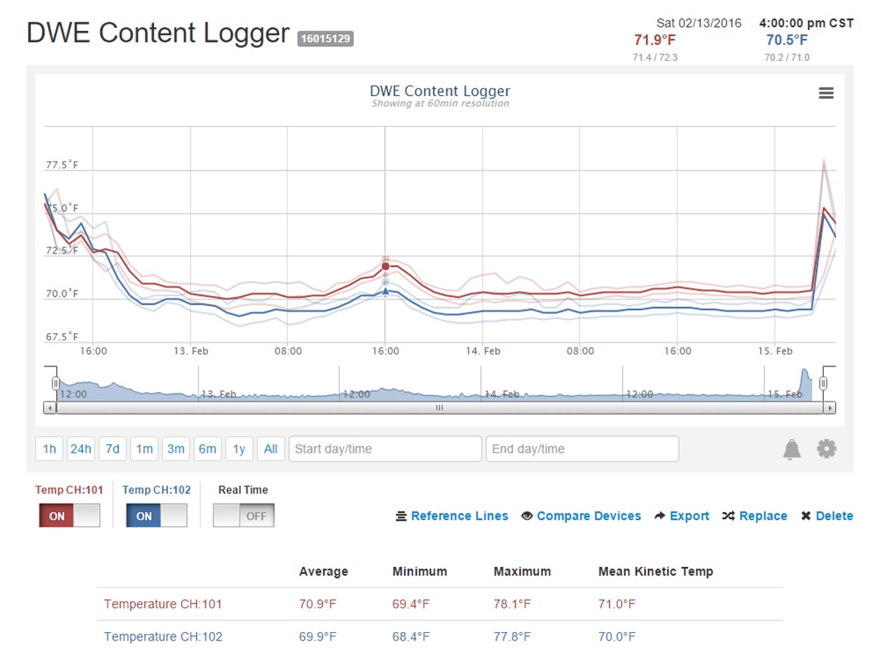 Last year we ran an experiment that showed how two probes as little as six feet apart could have drastically different readings. Below is an image from a DicksonOne account that shows the data, and an image of the probes hanging suspended in our warehouse.